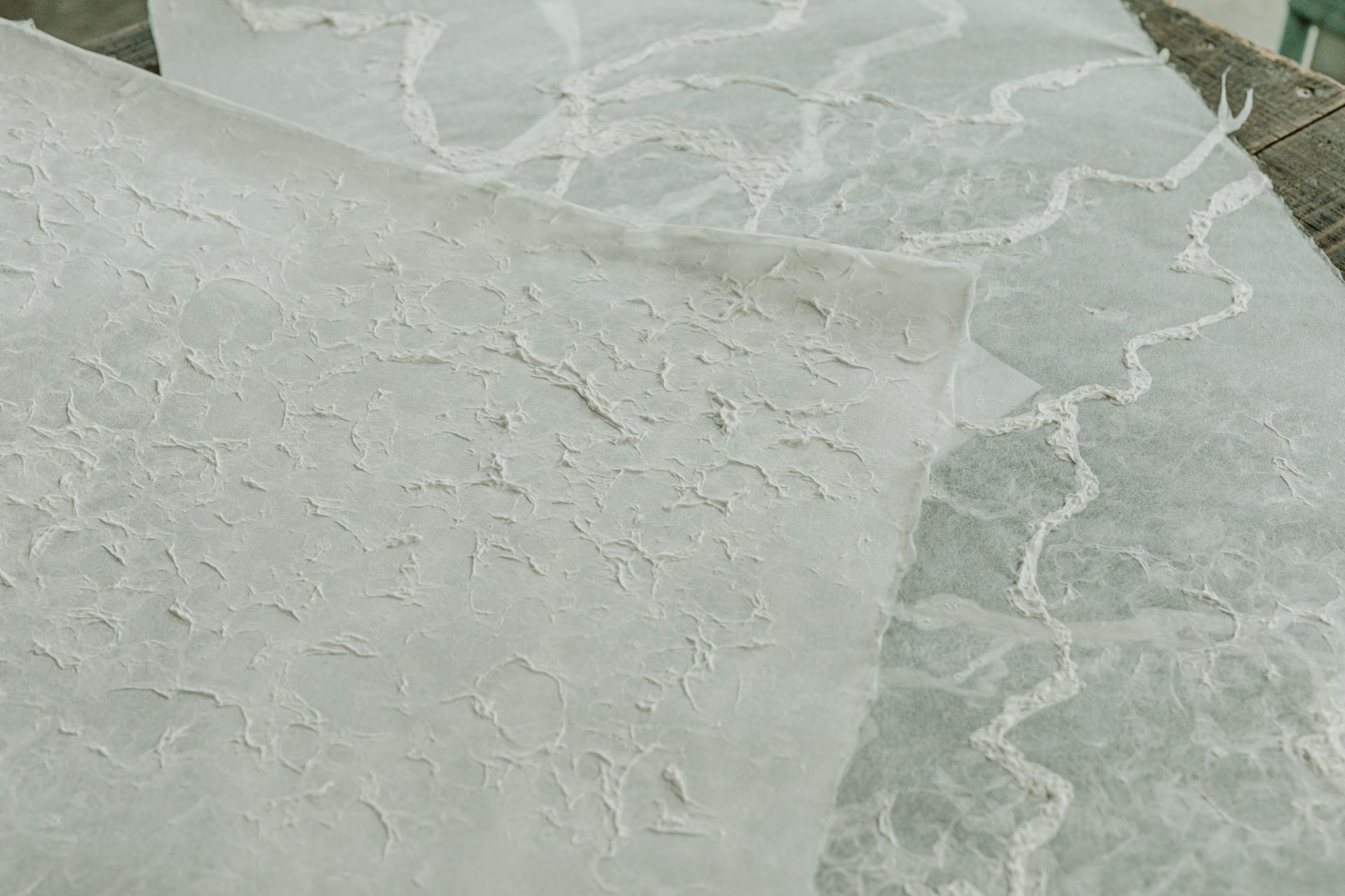 またライフワークとし天然紙の制作も手掛けている。長田和也は言う。「天然紙は一年に一度だけの制作で、完全無添加で原料を仕上げ、昔ながらのやり方で行うのでかなりの手間と時間を要します。でも実際に携わっていると、昔の方が今よりも効率的だったり、美しく仕上がったり、驚きや発見、課題が見えてきて、さらなる研究意欲がわいてきます。そして、技術の積み重ねが今につながっていることを実感するんです。また、紙としての原点回帰をしてみたかったのです。紙がいちばんなりたい形にしたかったのです。
