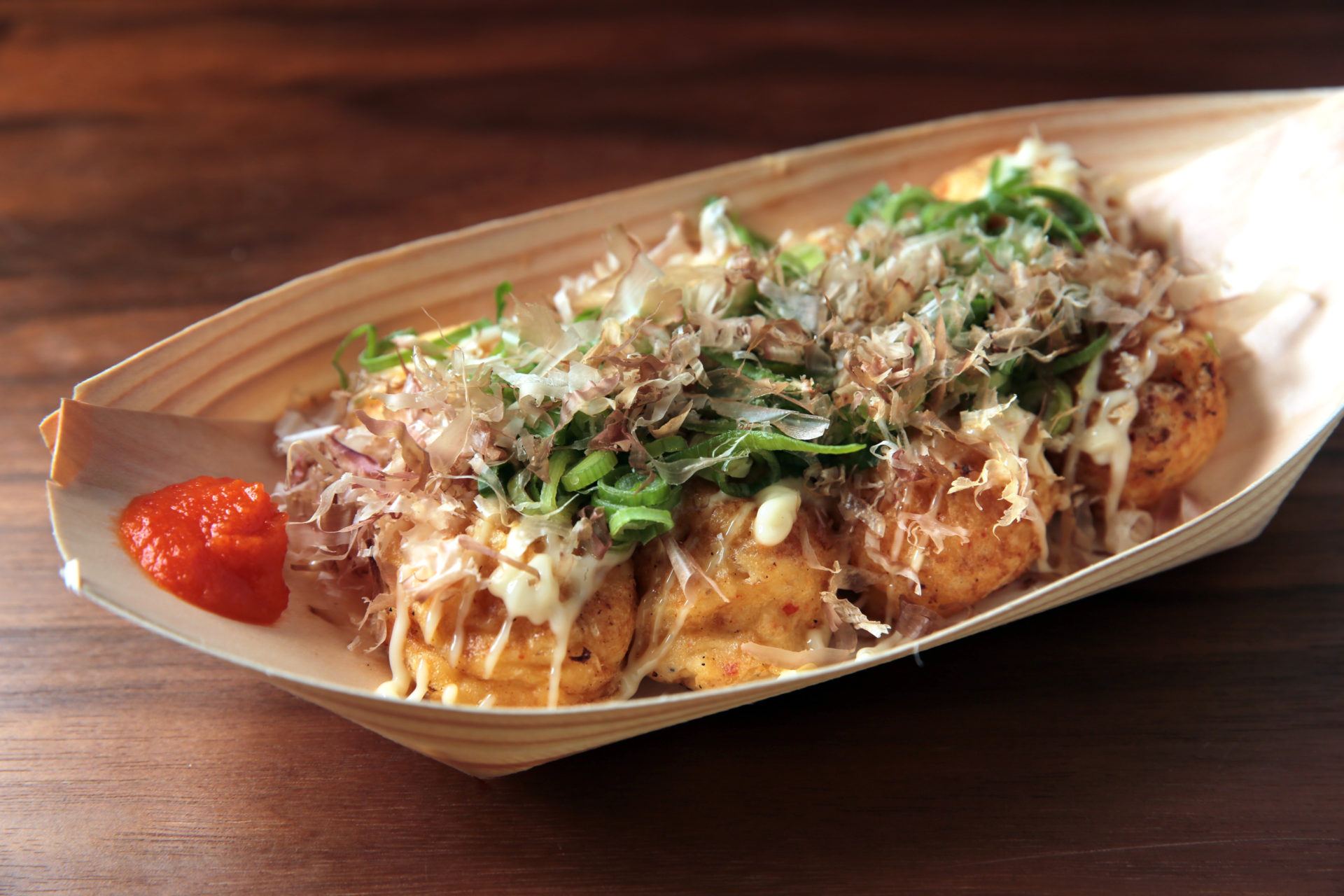 漆の里である鯖江市河和田地区伝統薬味「山うに」を、たこ焼きの生地に混ぜ込んで作った越前ご当地のたこ焼き。また、みたらし団子にも山うに味の蜜をご用意しております。ゆずのフレッシュな風味と赤なんばの旨味が、たこ焼きと団子に上品な味わいに引き立ててくれます。是非、お試しください。