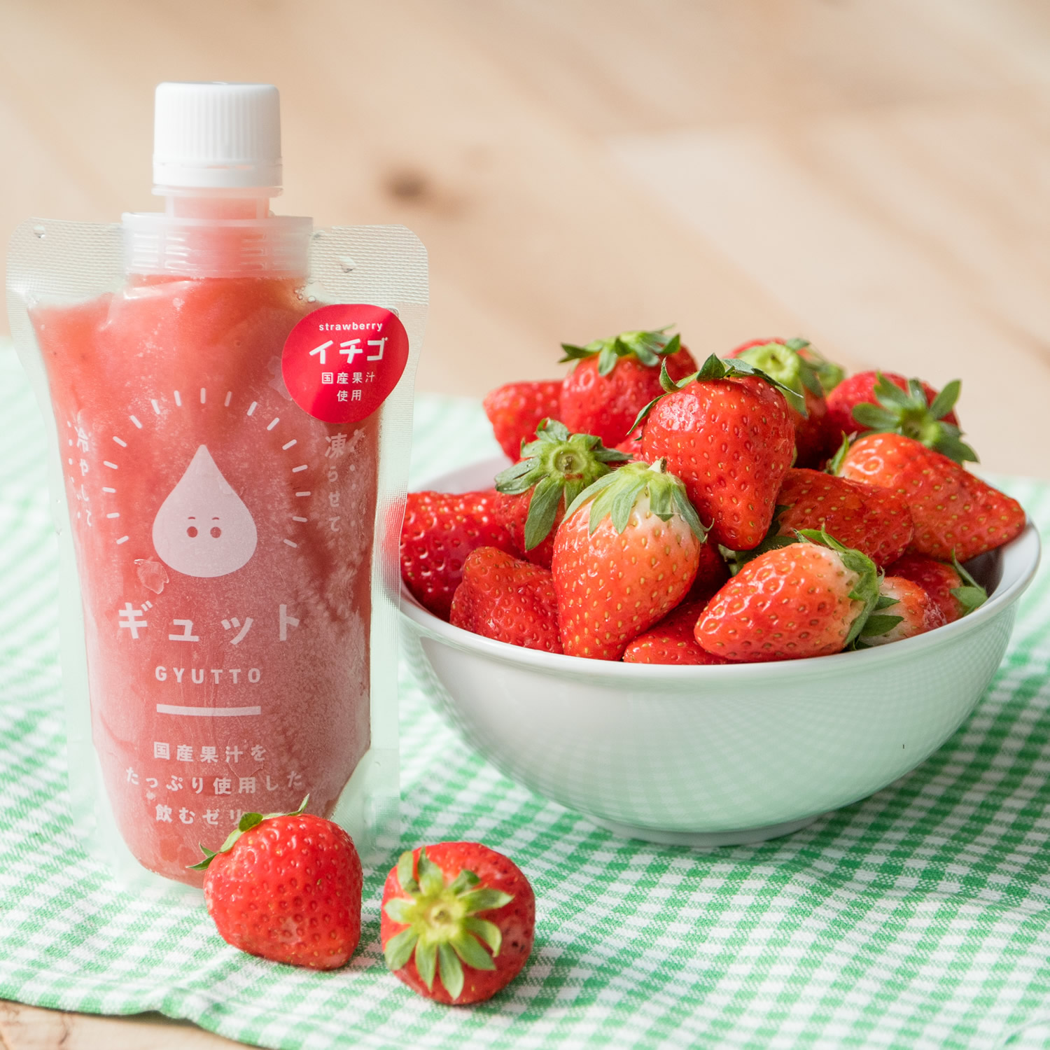 当社のゼリーは、「ギュットゼリー」の商標ブランドで販売しています。果物の果汁をぎゅっとしぼり、美味しさをぎゅっと閉じ込め、ぎゅっと手で押し込みながらお召し上がりいただけます。国内の生産農家様から無添加のストレート果汁やピューレを仕入れて製造しています。いつでもどこでも手軽にお召し上がり戴けるパウチタイプです。