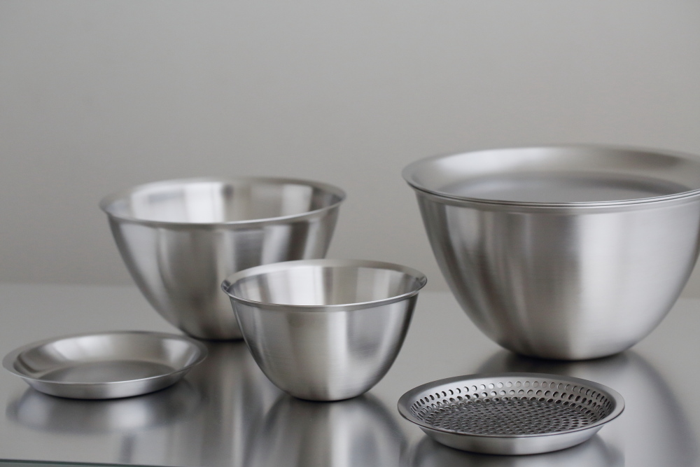 conte(コンテ)はステンレス加工の一大産地、新潟県燕ならではの道具を作るブランドです。街全体が工場と言える、分業の技の積み重ねで出来上がった台所道具は、派手さはありませんが、毎日の調理に欠かせなくなる使い心地になりました。工場から工場へ、一つの作業が終わるとコンテナと呼ばれる通い函で次の工程のために運ばれていきます。バトンリレーのように作業は受け継がれ、出来上がった新しい道具たちです。”フチまき”のないキッチンボウルシリーズの「まかないボウル」「まかない丸バット」「まかない平ザル」、そして「こします|オイルポット」や「やくさじ|計量スプーン」等の展示販売をいたします。
