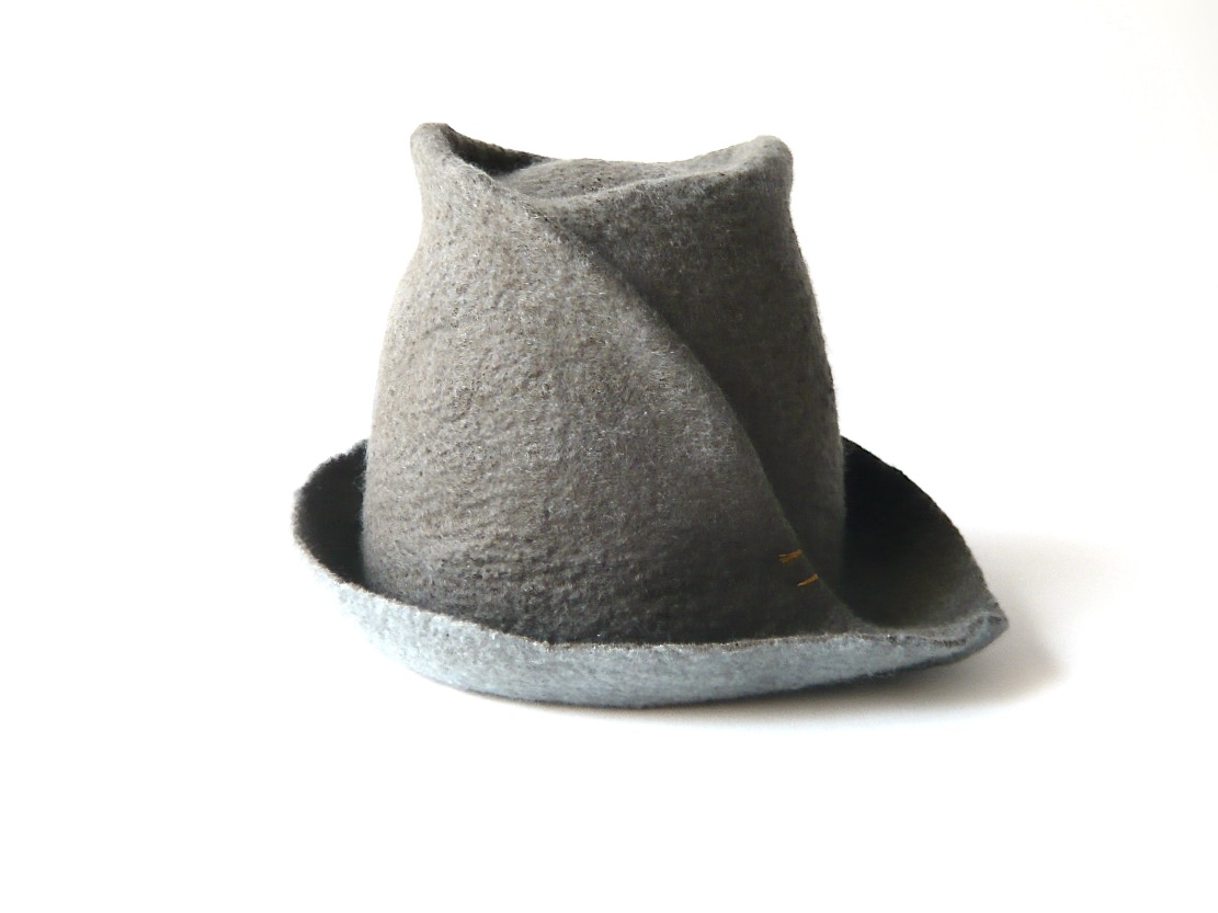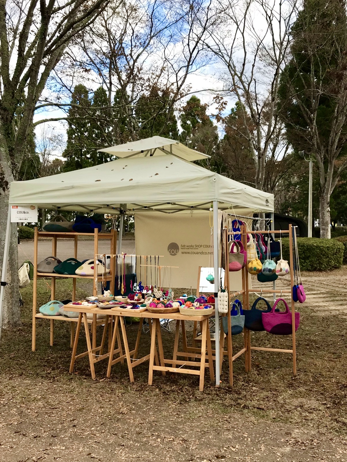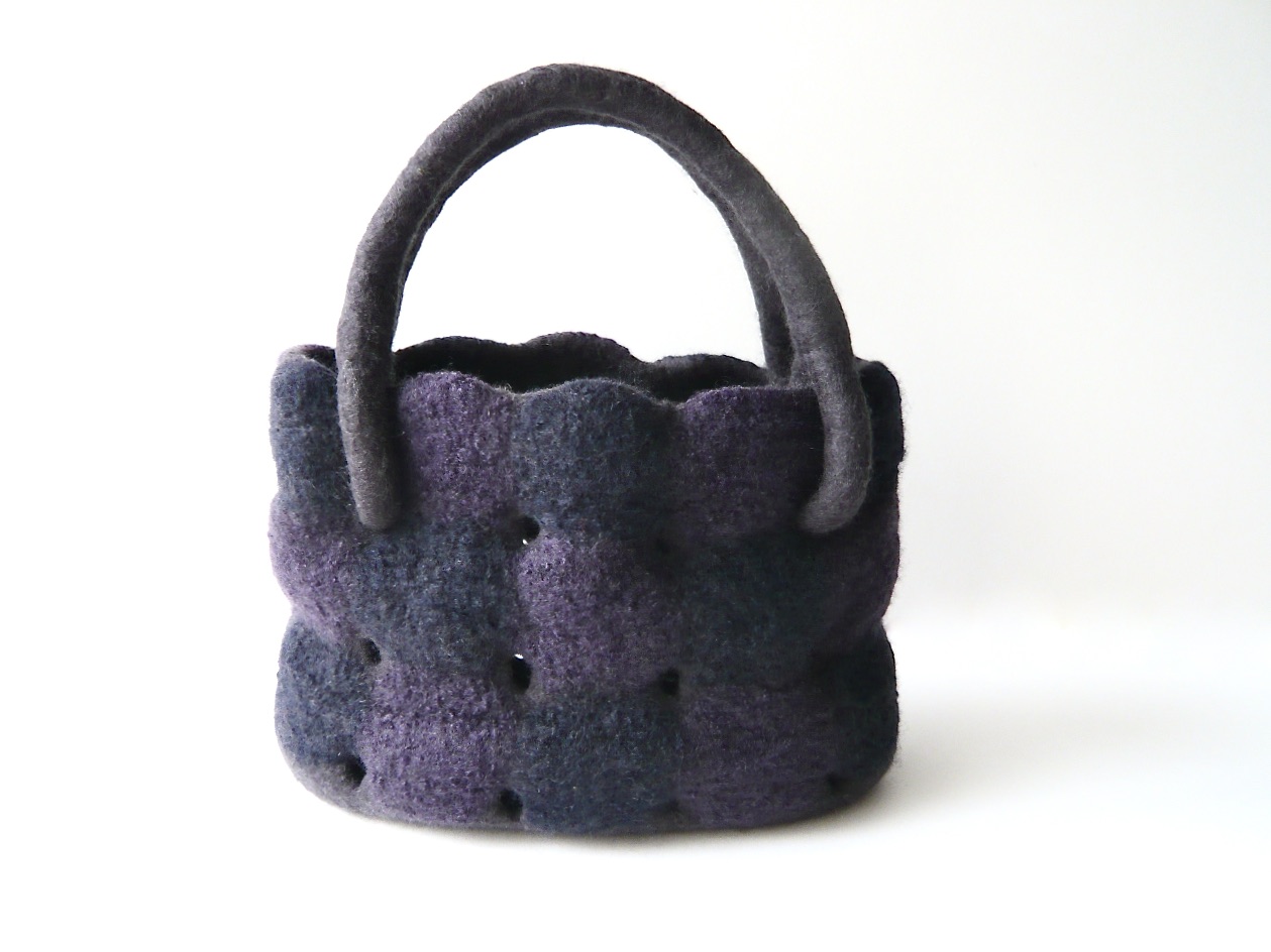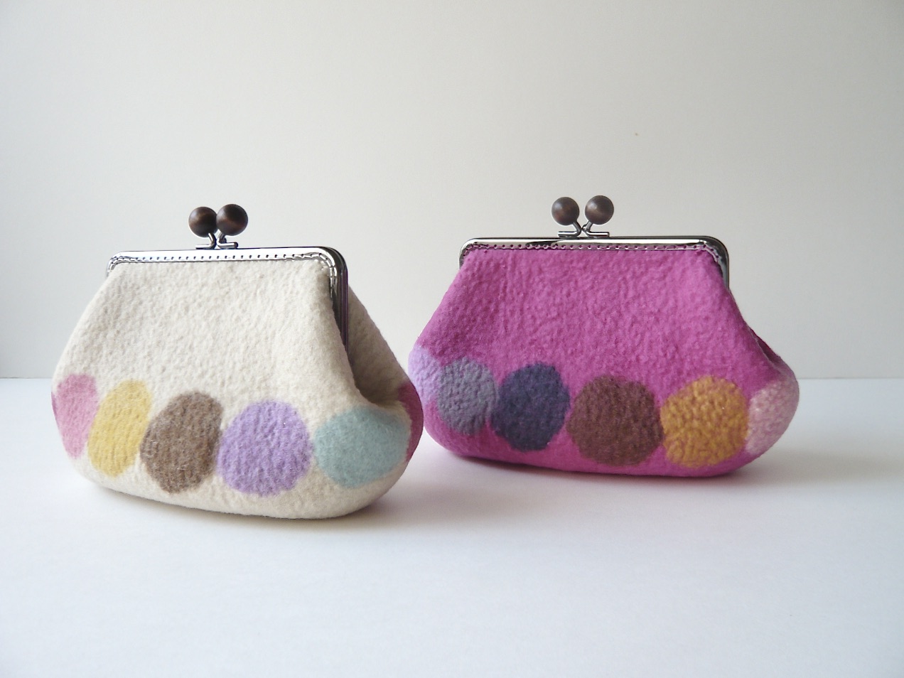 ふわふわの羊毛を薄くちぎって重ね、洗剤を含んだお湯でぬらして圧縮、摩擦などを繰り返し次第に繊維がからんでフェルトに、手仕事というよりはむしろ力を要することですが、ウールの縮む力を活かして思い描いた形に仕上げることに無限の可能性を感じます。つなぎ目のない一体化した不思議な形のバッグ、毛糸を渦状にまるくしたものとカラー原毛を合わせてまるいモチーフをつないだようなバッグやアクセサリー、ウールの利点を活かしたあったかな帽子など、色や形を楽しんで長く使っていただけるものを提案します。