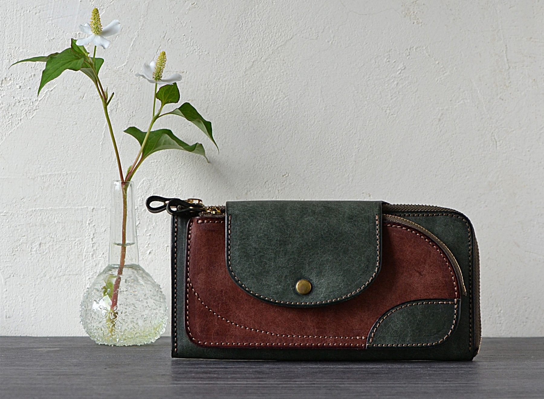 経年変化の良いタンニン鞣しのヌメ革を使用し、お財布をメインに革小物を製作しています。「ゆとりと緩さと快感のある使いやすさ」を最大のテーマとし、機能性と連携して作りこんだオリジナルのデザインを大切にしています。シンプル過ぎず、かと言って凝り過ぎず、甘過ぎず、かと言ってソリッド過ぎず。直線と曲線、ステッチやファスナー、金具を一枚の絵として成り立つよう絡み合わせて、長きに渡って微妙な可愛らしさを感じられる、そんな意匠を目指しています。力強くオリジナリティーの高い構造と、自分らしい使い勝手、そしてどこか柔らかみを感じられる包容力のあるかたち、それらの最大公約数を引き出すべく、アイディアを練り、試作を繰り返します。