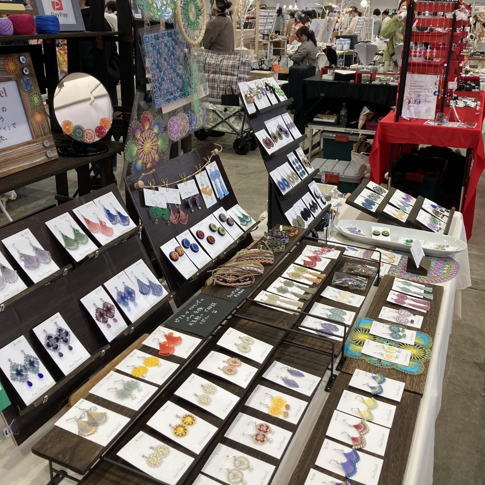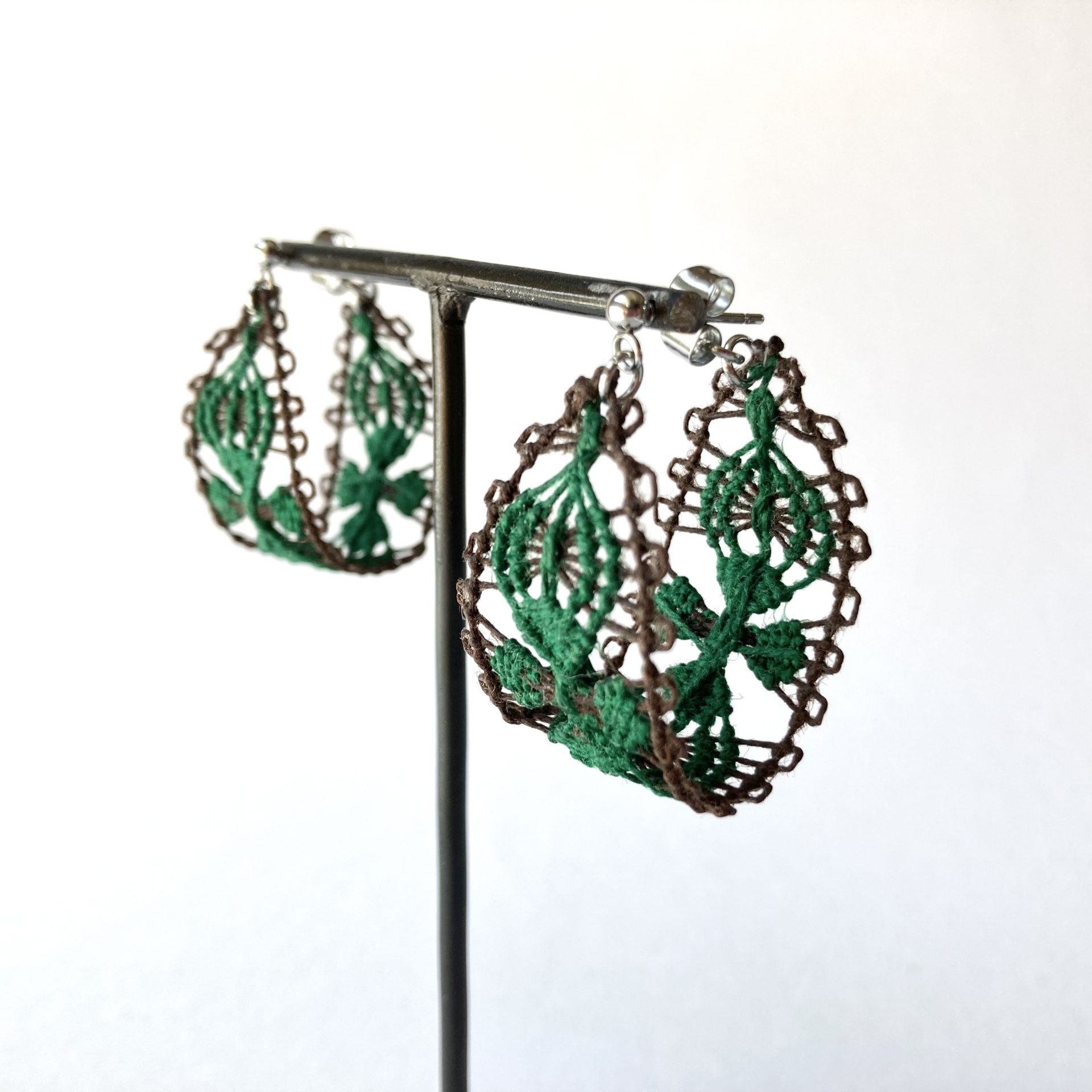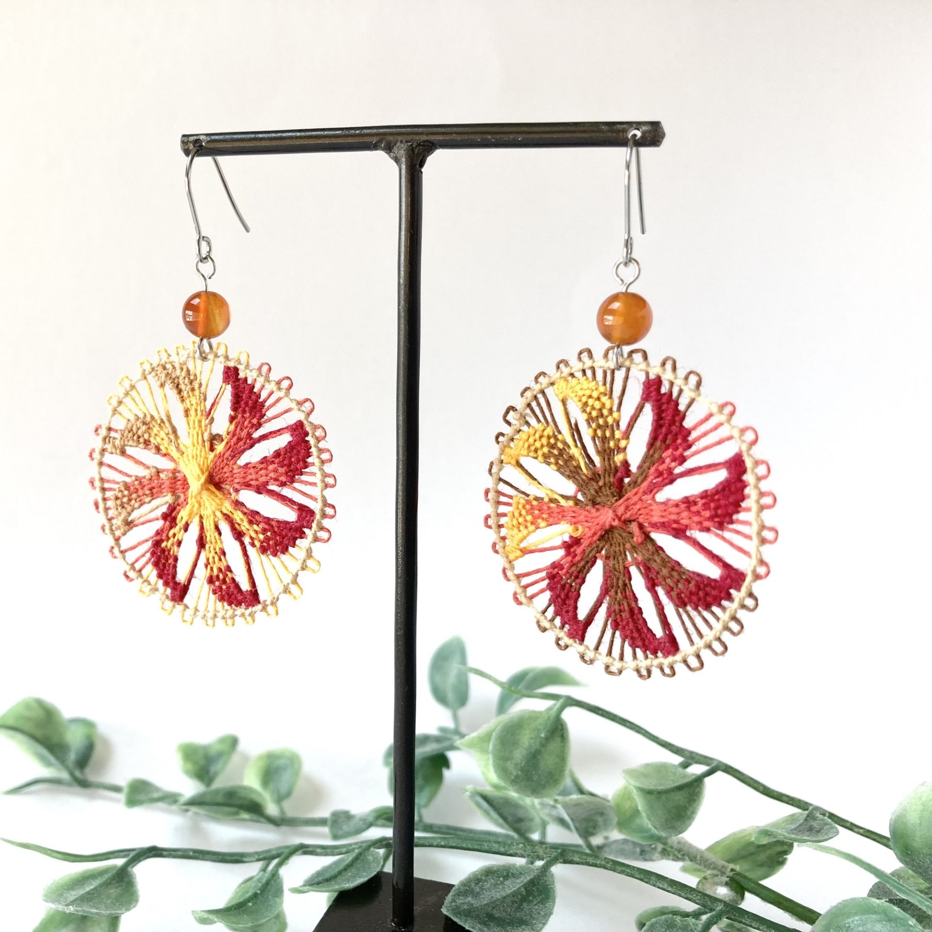 南米パラグアイの伝統刺繍ニャンドゥティ でアクセサリー・小物を制作しています。ニャンドゥティ は現地語グアラニー語で「蜘蛛の巣」を意味します。その名が表すとおり、細い糸を使って模様を作り上げていく繊細な手仕事です。木枠に布を張り、下糸を張り、そこに別の糸を編み込んだり、結び目を作ったりして模様を作っていきます。伝統的な模様は350種以上もあると言われています。糸の繊細さ、鮮やかさ、素材感が伝わるような、糸だからこその雰囲気で身につける人を引き立てるようなニャンドゥティ アクセサリーを目指しています。