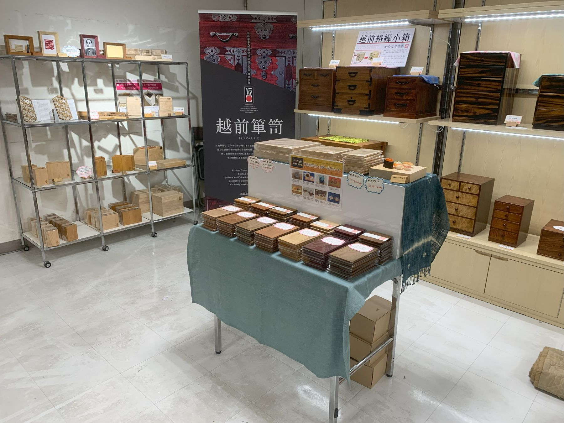 越前市の中心市街地にある「武生タンス町通り」にて、江戸時代から8代続く老舗タンス店。漆塗りに重厚な金具を飾った歴史と風格溢れる越前箪笥、和服の総桐タンスや大事なモノを収納する整理箱や小箱、ケヤキやトチなど銘木一枚板のテーブル、心温まる木製の雑貨や玩具など、木工製品を製造販売しております。