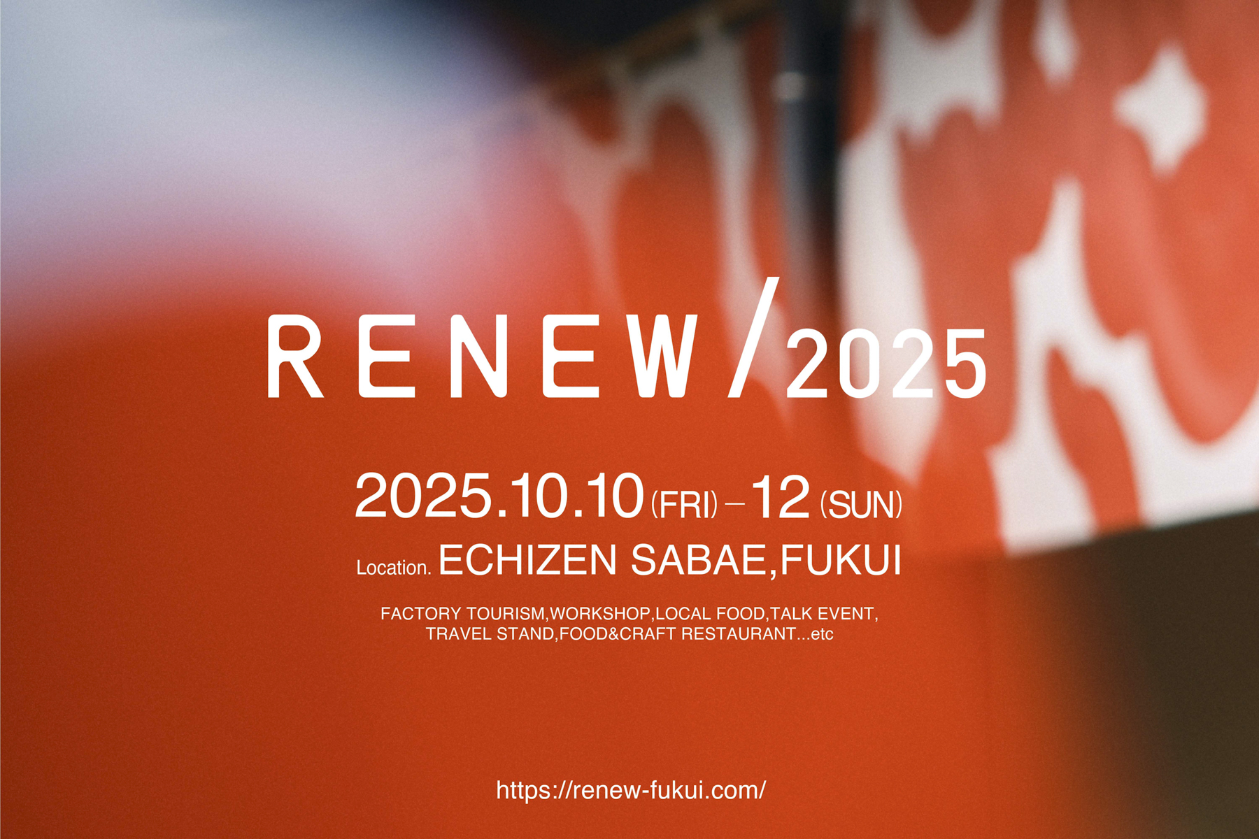 「RENEW(リニュー)」は、福井県鯖江市・越前市・越前町で開催される、持続可能な地域づくりを目指した工房見学イベント。会期中は、越前漆器・越前和紙・越前打刃物・越前箪笥・越前焼・眼鏡・繊維の7産地の工房・企業を一斉開放し、見学やワークショップを通じて、一般の人々が作り手の想いや背景を知り、技術を体験しながら商品の購入を楽しめます。2025年10月10日(金)〜12日(日)開催。